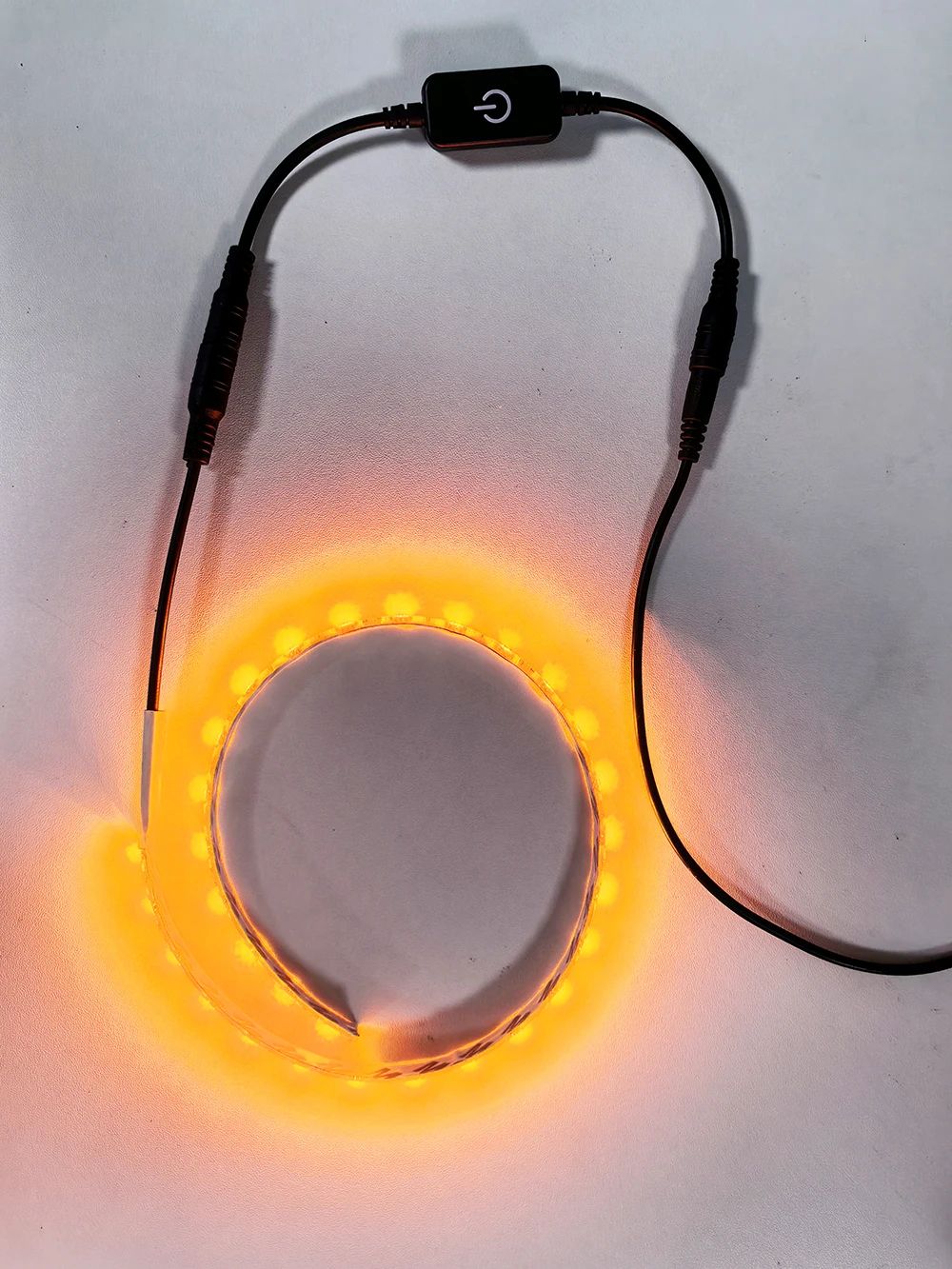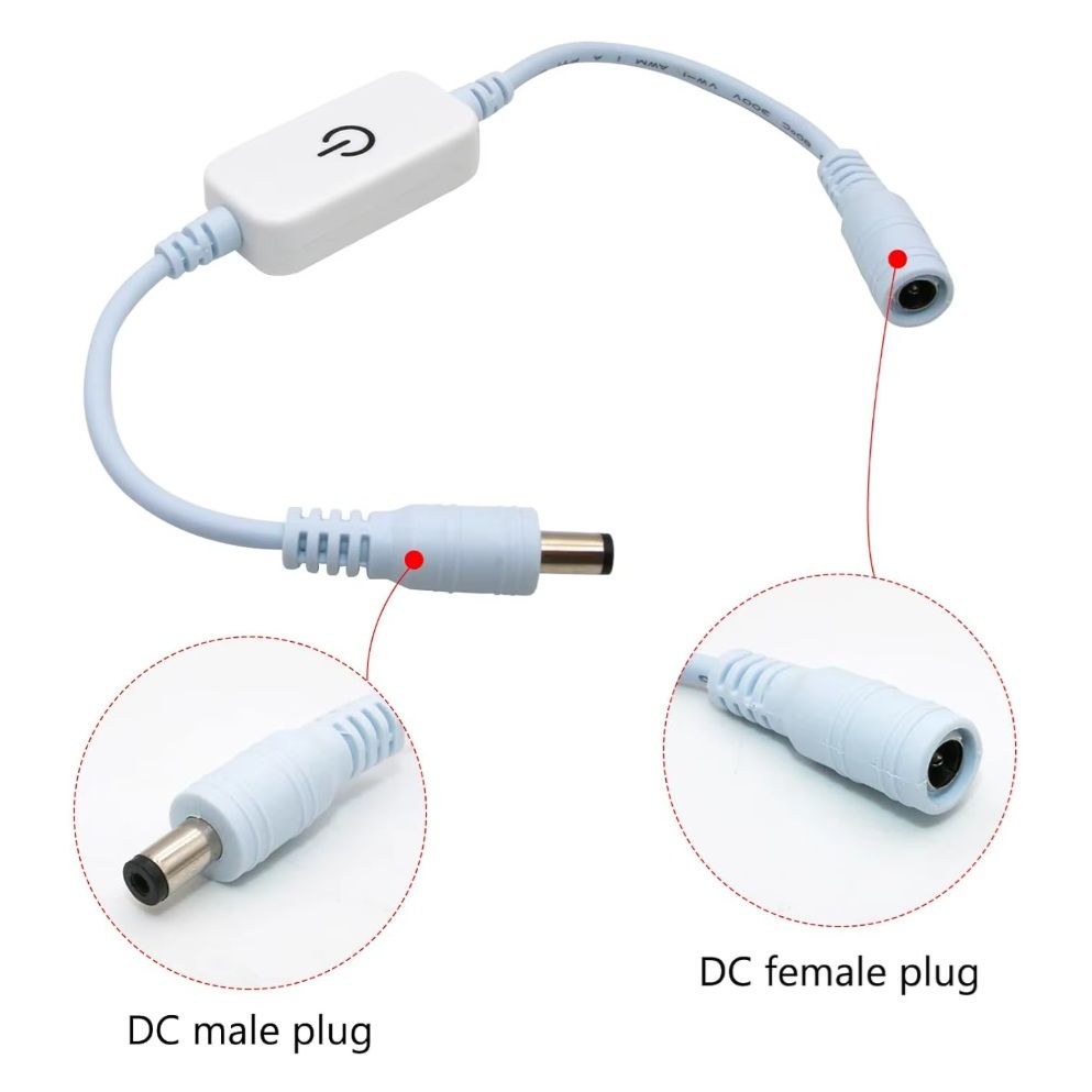 Цей димер оснащений стандартними роз'ємами живлення DC 5.5×2.1 мм (штекер та гніздо), що забезпечує просте підключення без необхідності паяння або складного монтажу. Завдяки компактному корпусу та кабелю з довжиною 30 см пристрій легко інтегрується в систему освітлення, підсвічування меблів, декоративних світлових рішень чи рекламних конструкцій.