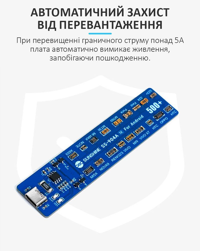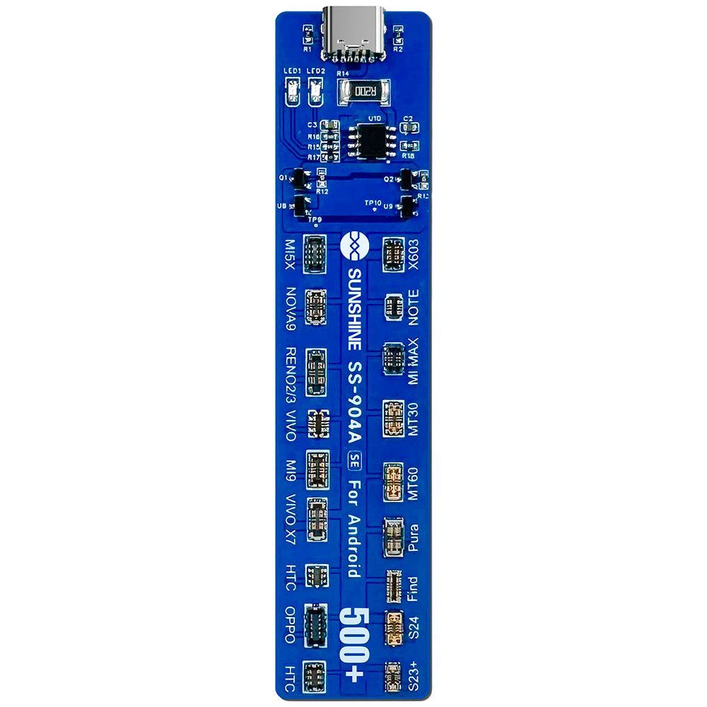 SUNSHINE SS-904A SE – це професійна плата активації акумуляторів, призначена для запуску, діагностики та відновлення батарей смартфонів на базі Android. Пристрій розроблений для сервісних центрів та майстрів з ремонту мобільної техніки, забезпечуючи безпечну та швидку роботу з акумуляторами різних виробників.