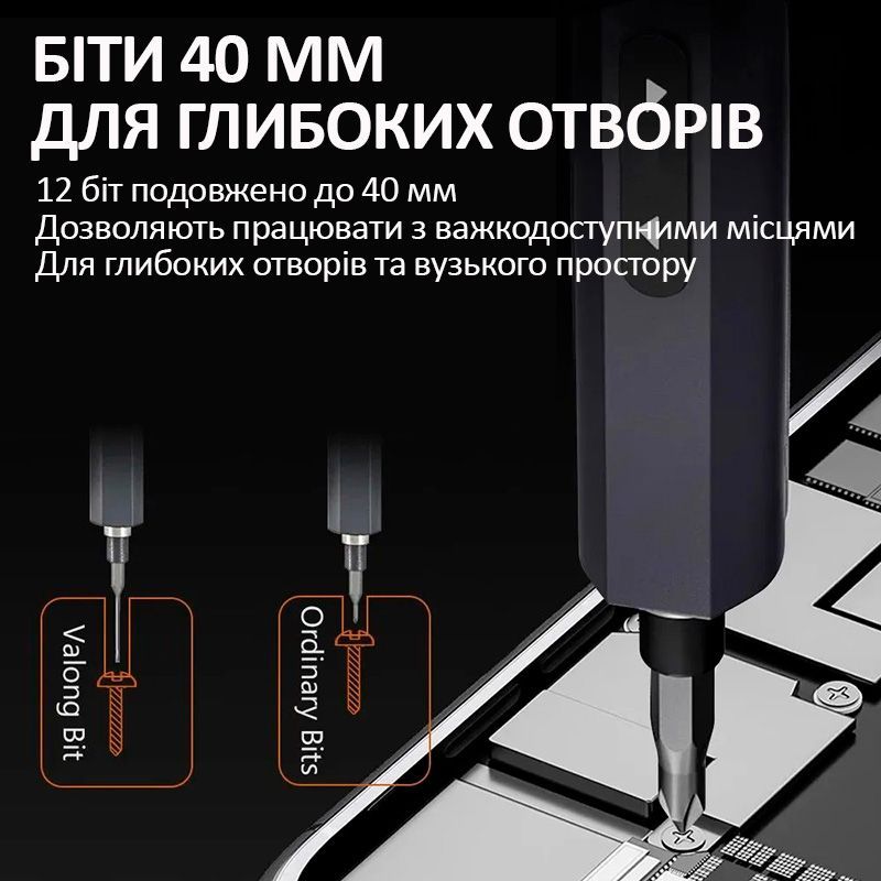 - Ця викрутка комплектується універсальним набором біт, що покриває практично всі завдання: