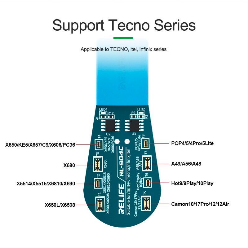 - Пристрій підтримує велику кількість моделей смартфонів Tecno, Itel та Infinix, включаючи популярні лінійки Camon, Pop, Spark та інші. Це робить її універсальним інструментом для щоденної роботи.