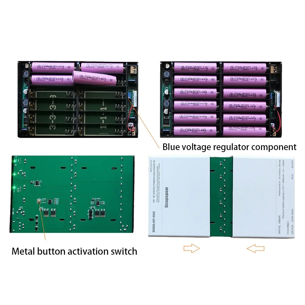 - Дозволяє самостійно вибрати та встановити до 12 акумуляторів 18650, регулюючи підсумкову ємність та час автономної роботи.