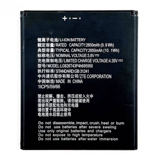 Акумулятор для ZTE Blade A530 - Li3826T43P4H705949/Li3826T43p4h695950 - 2600 mAh, оригінальний, 12 місяців гарантії