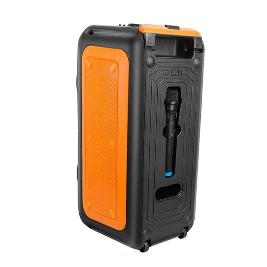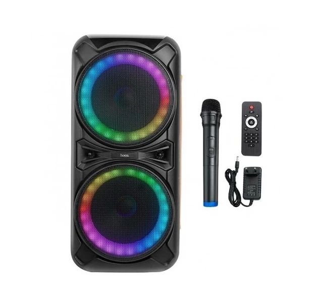 HOCO DS42 - це потужна портативна акустична система, створена для яскравих вечірок, домашніх розваг та активного відпочинку. Колонка оснащена двома сабвуферами та твіттером, що забезпечують потужні баси та кристально чисті середні та високі частоти. LED RGB-підсвічування з чотирма режимами додає атмосфери, а два бездротові цифрові мікрофони роблять її ідеальним вибором для караоке.