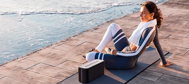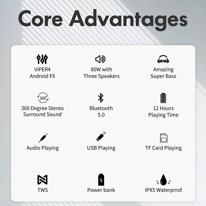 - Широкосмугові динаміки та професійний сабвуфер відтворюють чистий та енергійний звук музичних треків. Колонка грає голосно та поширює звук у просторі на 360 градусів, створюючи стійкий ефект оточення музикою з усіх боків.