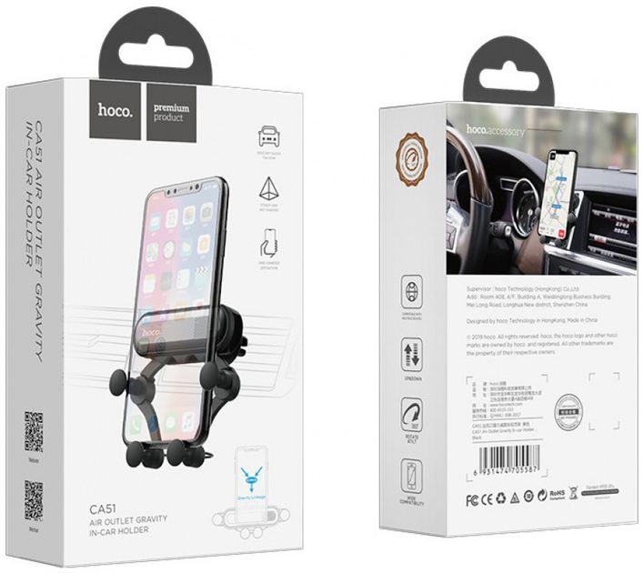 Hoco CA51 — це стильний, практичний і надійний аксесуар для вашого автомобіля, що забезпечує зручне розташування смартфона під час поїздок. Завдяки кріпленню на вентиляційну решітку тримач не заважає огляду водія, підвищуючи рівень безпеки і комфорту за кермом.