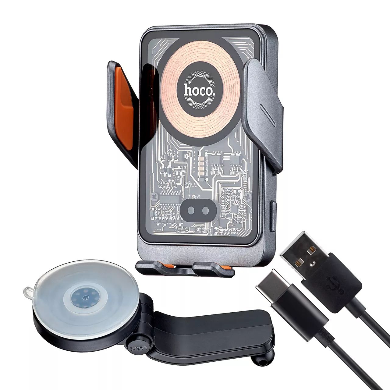 Автотримач Hoco HW8 з функцією бездротової зарядки (center console) сірий металевий