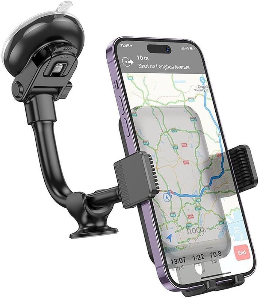 - Посилена присоска забезпечує міцну фіксацію на гладких поверхнях (лобове скло, панель приладів, центральна консоль), утримуючи смартфон навіть за різких маневрів та руху по нерівній дорозі.