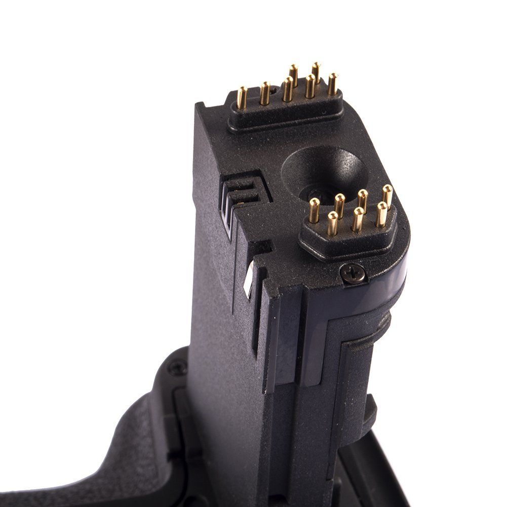 - Корпус батарейного блоку виконаний із міцних композитних матеріалів із прогумованими вставками, ідентичними за текстурою корпусу камери. Встановлений блок виглядає як єдине ціле із фотоапаратом, не порушуючи естетики пристрою.