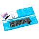 Бюджетний бездротовий набір. Працює від одного USB передавача. Сумісний практично з усіма сучасними пристроями та операційними системами. Повнорозмірна клавіатура із цифровим відділом. Працює від 1 батареї AA. Хід клавіш досить м'який та комфортний. Розкладні ніжки для регулювання нахилу клавіатури (2 положення). Досить компактна, щоб носити в рюкзаку (440мм довжина). Миша працює практично на будь-яких поверхнях, навіть на білому аркуші паперу. Працює від 1 батареї AA. Відмінне рішення для офісу, навчання.
