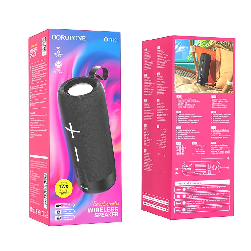 Borofone BR19 – це компактна та потужна портативна колонка, що забезпечує чистий та збалансований звук з глибокими басами завдяки двом динамікам по 5 Вт та вбудованому низькочастотному випромінювачу. Завдяки ефекту 360 ° HiFi, колонка занурює вас в об'ємне звучання.
