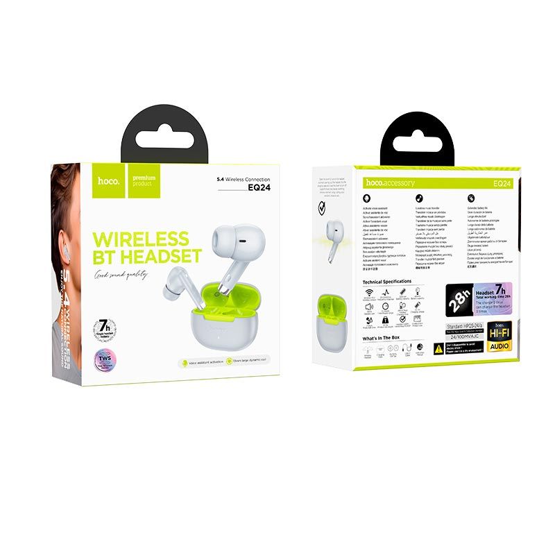 HOCO EQ24 - це сучасні бездротові навушники, які поєднують якісний звук, зручність управління і стильний дизайн. Вони ідеально підходять для активного способу життя, занять спортом, повсякденного використання та комфортного спілкування. Завдяки передовій технології Bluetooth 5.4 та сумісності з голосовими помічниками, HOCO EQ24 забезпечують надійне з'єднання та інтуїтивно зрозуміле керування.
