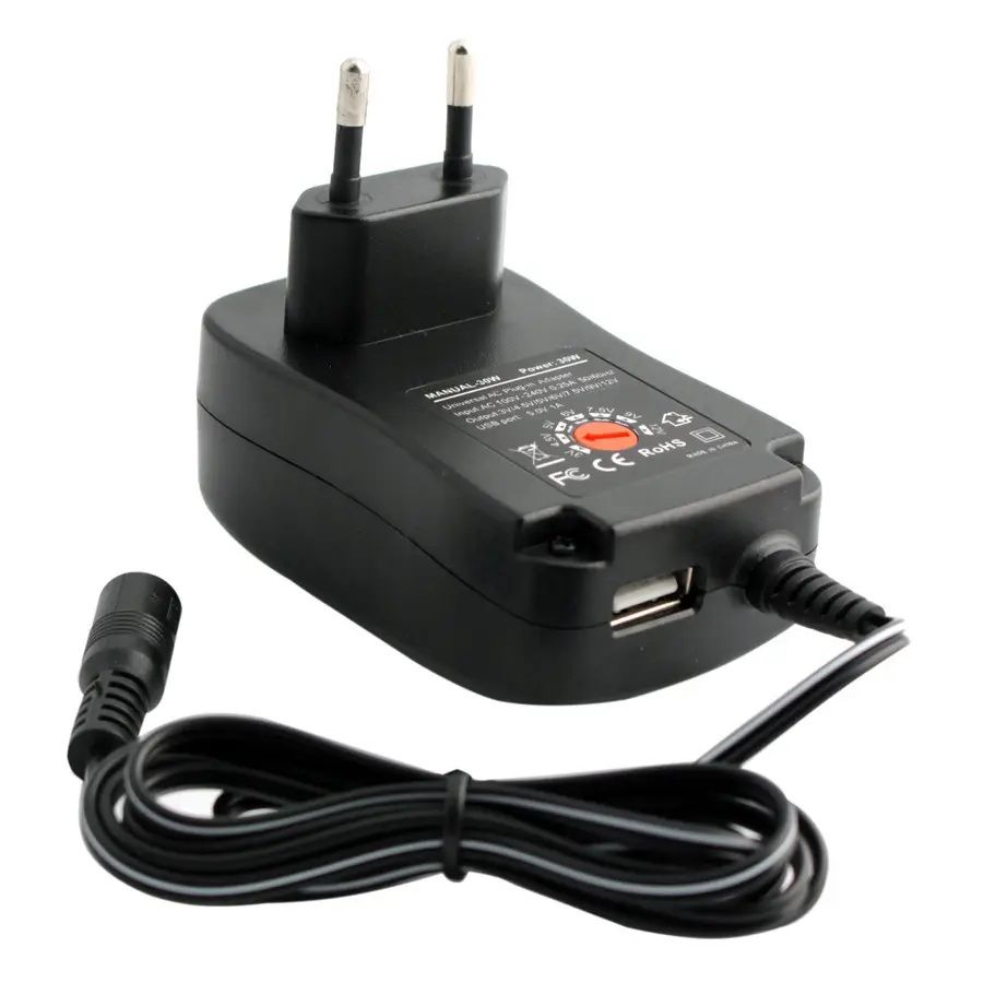 - Вибір вихідної напруги: 3V, 4.5V, 5V, 6V, 7.5V, 9V та 12V підходить для більшості малопотужних пристроїв, включаючи LED-освітлення, камери відеоспостереження, радіопристроїв та ін.