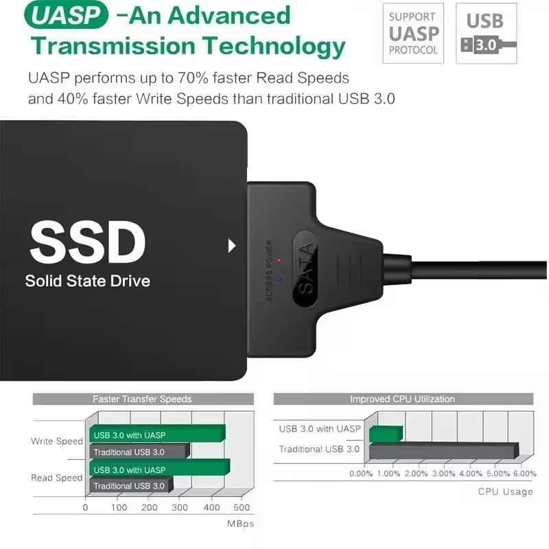 - Завдяки інтерфейсу SATA III та підтримці протоколу UASP, цей кабель забезпечує на 70% швидше читання та на 40% швидше записування, ніж традиційні USB 3.0 кабелі.