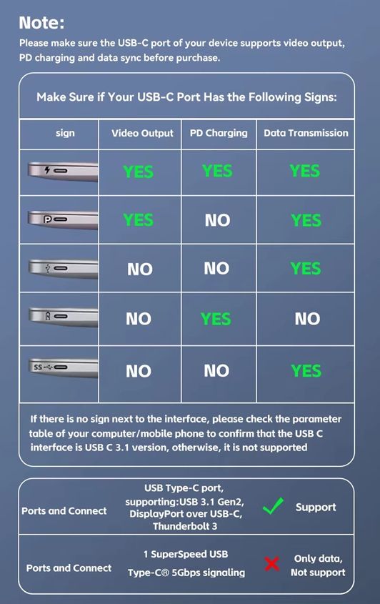 - Деякі пристрої мають кілька Type-C портів, але лише один підтримує відеовихід. Переконайтеся, що ви використовуєте правильний порт.