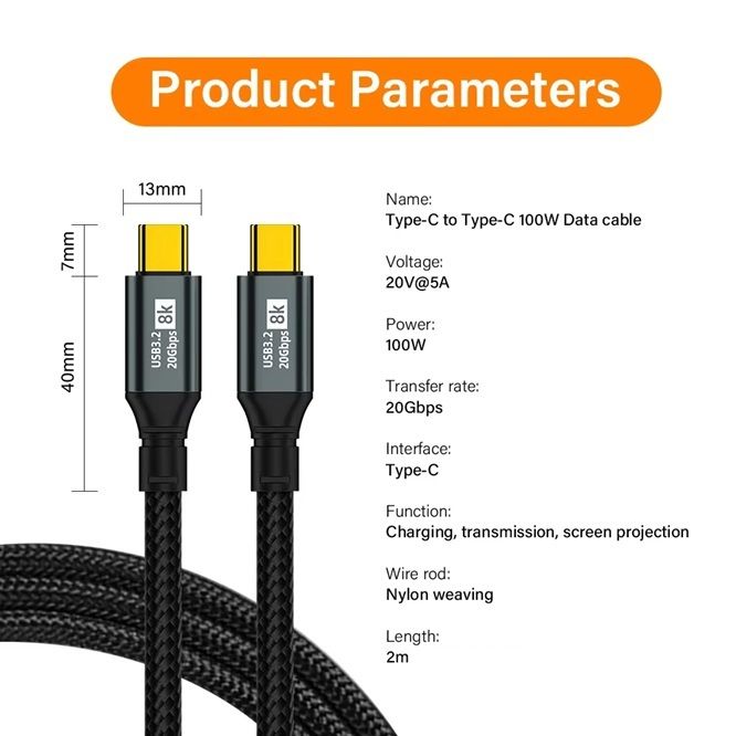 Це універсальне рішення для швидкого заряджання, передачі даних та виведення зображення у високій роздільній здатності. Підтримує потужність до 100W, швидкість передачі даних до 20Gbps та роздільну здатність відео до 8K при 60 Гц.