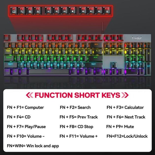 - Клавіатура T-Wolf T17 є поєднанням сучасної естетики та функціональності. Вона має повнорозмірну розкладку із 104 клавіш, що ідеально підходить як для ігор, так і для роботи. Домінуючий чорний колір та RGB підсвічування з 20 режимами роботи не лише прикрашають ваш робочий простір, а й дозволяють створити унікальну атмосферу для кожної гри.