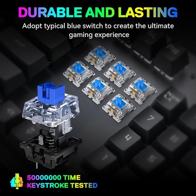 - Клавіатура оснащена високоякісними механічними перемикачами Blue Switch, що забезпечують чіткий тактильний зворотний зв'язок та яскраво виражений звуковий клік при натисканні. Ці перемикачі відомі своєю надійністю та призначені для забезпечення до 50 мільйонів натискань, що робить T-Wolf T17 надійним вибором для серйозних геймерів та професіоналів.