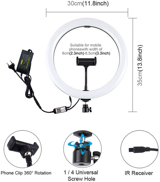 Кільцева LED лампа Puluz PU411EU 12" – це ідеальний інструмент для створення якісного освітлення у фото- та відеозйомці. Вона забезпечує рівномірне і м'яке світло, яке допоможе підкреслити природну красу і покращити якість контенту. Лампа ідеально підходить для блогерів, фотографів, візажистів, всіх майстрів манікюру і майстрів манікюру.
