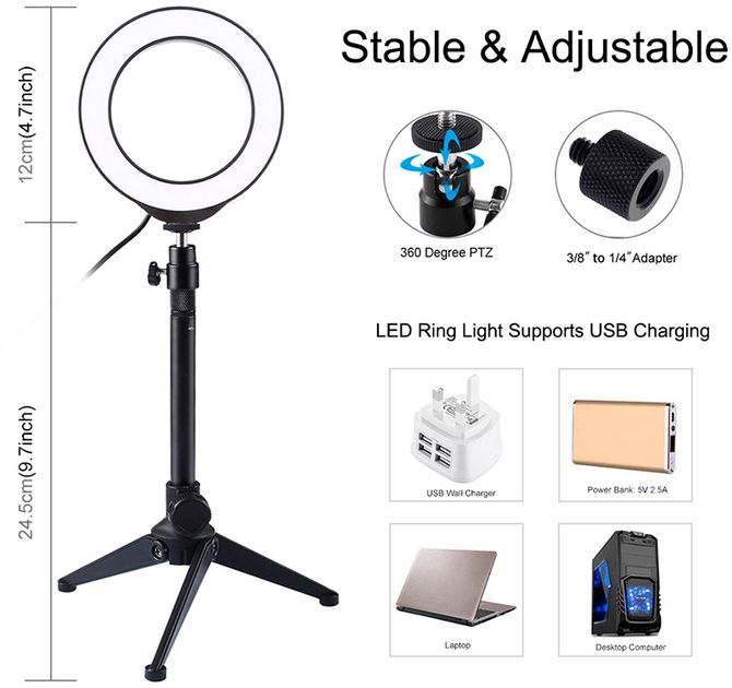 Кільцева USB LED лампа Puluz PKT3031 4.7" з настільним штативом