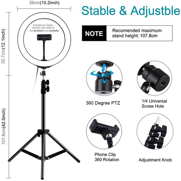 Розмір світлодіодного кільця: 26×26 см (26×30.7 см із кріпленням)