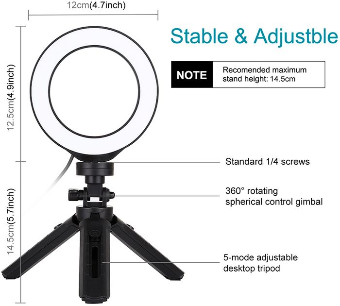 Кільцева LED лампа Puluz PKT3058B 4.7" – це компактне та зручне рішення для освітлення при зйомці фото та відео, відеодзвінків, стрімінгу та макіяжу. Завдяки невеликому розміру та зручному штативу заввишки 12 см, лампа ідеально підходить для встановлення на столі, забезпечуючи рівномірне та м'яке світло.