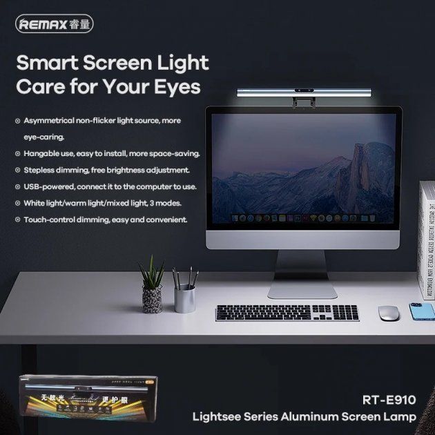 Лампа-скрінбар Remax RT-E910 Lightsee series - це джерело світла, яке допоможе висвітлити робочий стіл з комп'ютером, зберігши на ньому корисний простір для інших аксесуарів. Дана модель призначена для кріплення на верхню грань монітора, де встановлюючись вона не заважає огляду і не спотворює зображення, що відображається на екрані, так як її світло не відображається в ньому, а направляється прямо на стіл перед ним. Лампа реалізована в практичному, мінімалістичному дизайні, який дозволяє їй лаконічно вписатися в будь-який сучасний інтер'єр. Надійна конструкція пристрою виготовлена з металу, міцного ABS пластику та полікарбонату, з якого виконаний розсіювач, що прикриває якісні світлодіоди, що світять приємним, безпечним світлом без мерехтіння та шкідливого для очей синього відтінку. Модель підтримує безступінчасте регулювання яскравості та може працювати у трьох різних колірних режимах: з білим світлом, з теплим світлом та змішаним режимом. Аксесуар сумісний і з плоскими моніторами, і із заокругленими, що мають товщину від 5 до 55мм. До джерела живлення лампа підключається через звичайний роз'єм USB;