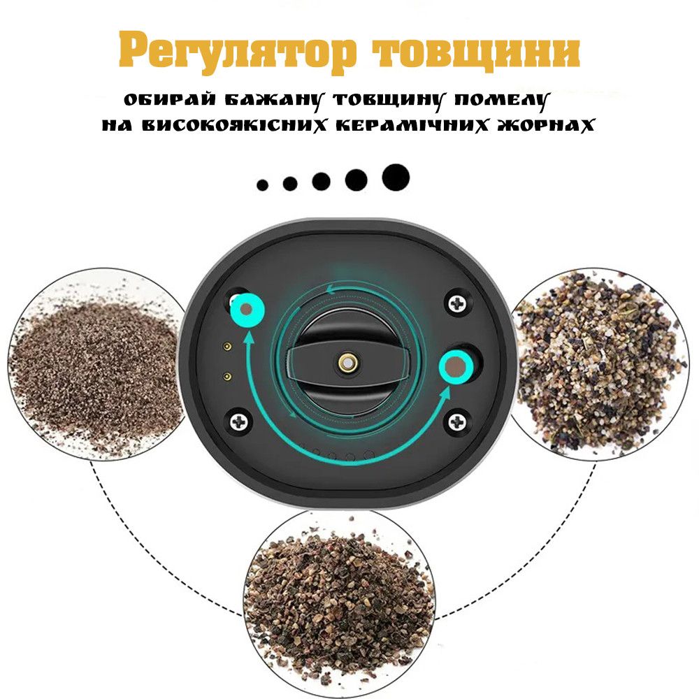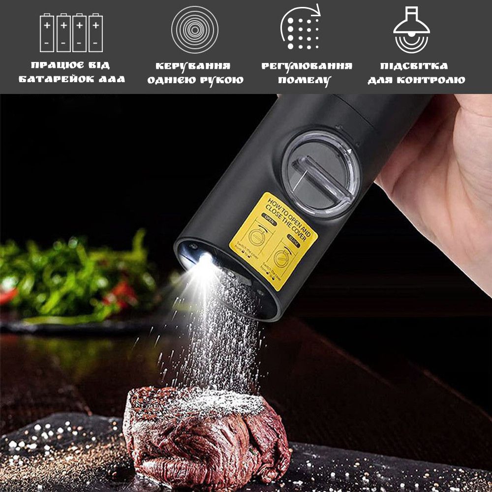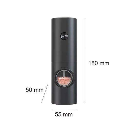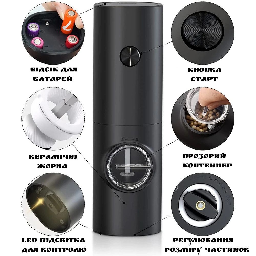 Млинок для перцю і спецій KYMQ-14 електричний, з налаштовуваним помелом, портативний, на батарейках 4xAAA (міні-пальчик), 70ml, 55x50x180mm, black