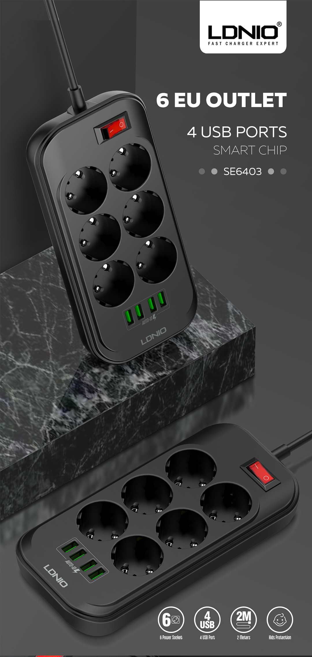 LDNIO SE6403 — це багатофункціональний мережевий фільтр подовжувач з довжиною проводу 2 метри, призначений для під'єднання та заряджання різної техніки.
