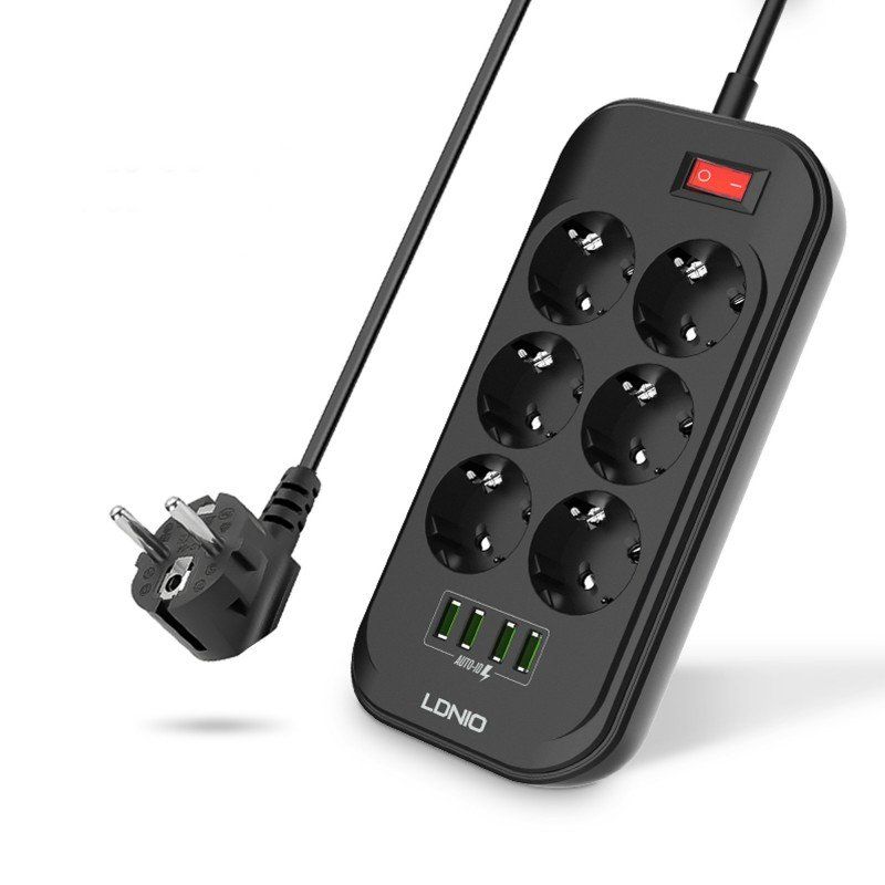 Мережевий подовжувач LDNIO SE6403 | 2500W, 2м з USB, 4 портами, 6 розетками, 3.4A, чорний