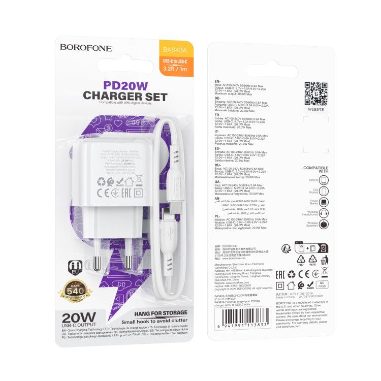 BOROFONE BAS43A – це універсальний зарядний пристрій із портом Type-C, який підтримує швидку зарядку до 20 Вт. Він ідеально підходить для смартфонів, планшетів, навушників, повербанків та інших пристроїв, забезпечуючи швидку, ефективну та безпечну зарядку у будь-який час.