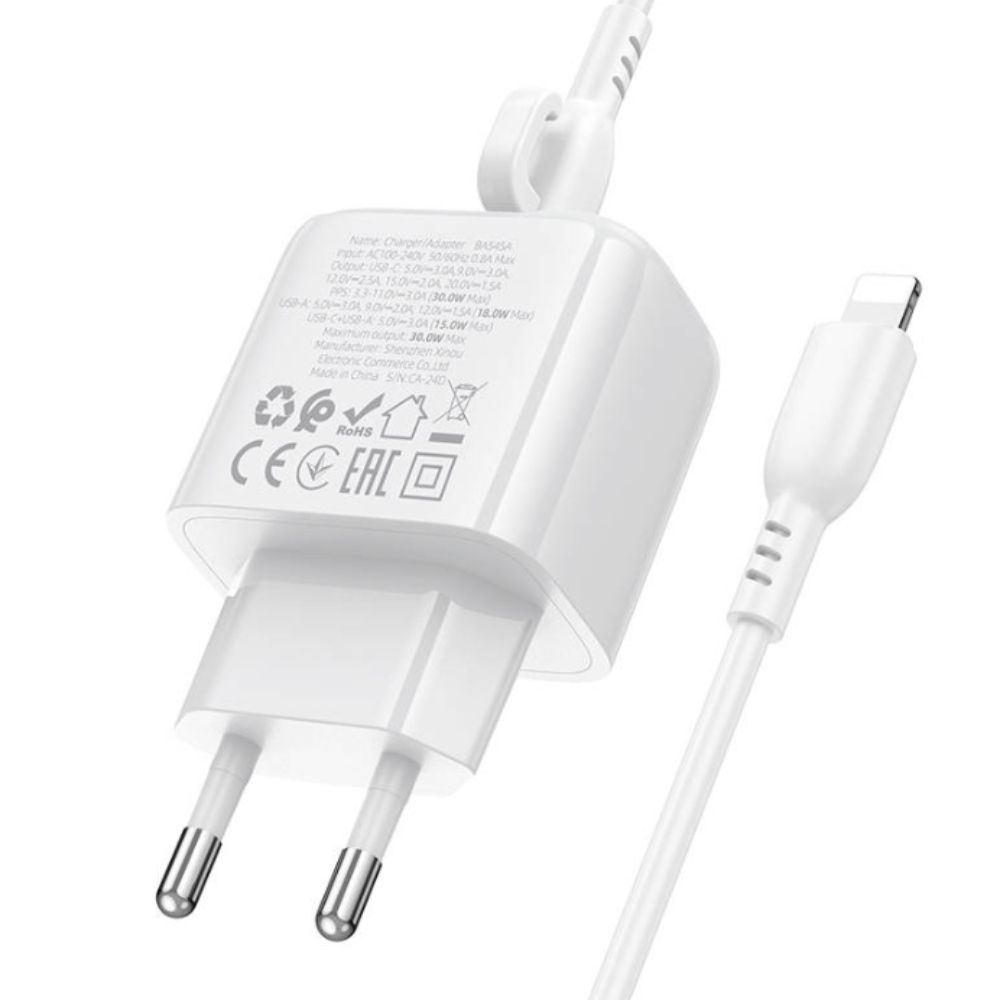 Білий зарядний пристрій Borofone BAS45A 1USB-C/1USB PD/QC 30W+Type-C to Lightning
