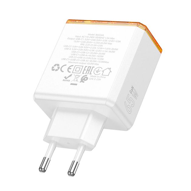 Мережевий Зарядний пристрій Borofone BAS34A 2Type-C/1USB PD/QC 65W Білий