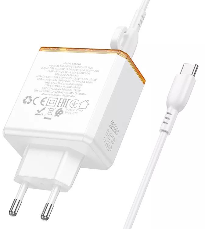 Зарядний пристрій Borofone BAS34A – це високотехнологічний адаптер із трьома роз'ємами, який підтримує сучасні протоколи швидкого заряджання та забезпечує максимальну ефективність завдяки технології GaN. Цей компактний та стильний адаптер стане чудовим рішенням як для дому, так і для подорожей.
