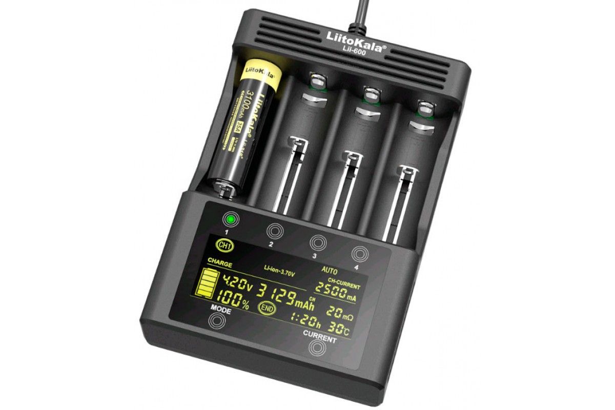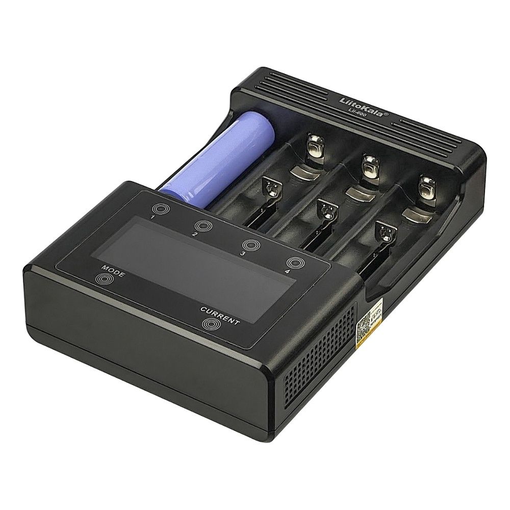 Інтелектуальний зарядний пристрій LiitoKala Lii-600 – це багатофункціональний зарядний пристрій із сенсорним керуванням, функцією заряду, розряду, тестування акумуляторів, інформативним LCD дисплеєм на якому відображається ємність, внутрішній опір, відсоток заряду та температура акумулятора. Це найпередовіша модель у ряді зарядних пристроїв компанії LiitoKala, яке може одночасно заряджати струмом до 3А від 1 до 4 циліндричних акумуляторів різного хімічного складу – Li-Ion, NiCd, NiMH практично всіх типорозмірів акумуляторів АА, ААА, С (R14), A, SC, 14500, 16340, 18350, 18650, 21700, 20700, 26650 та інші.