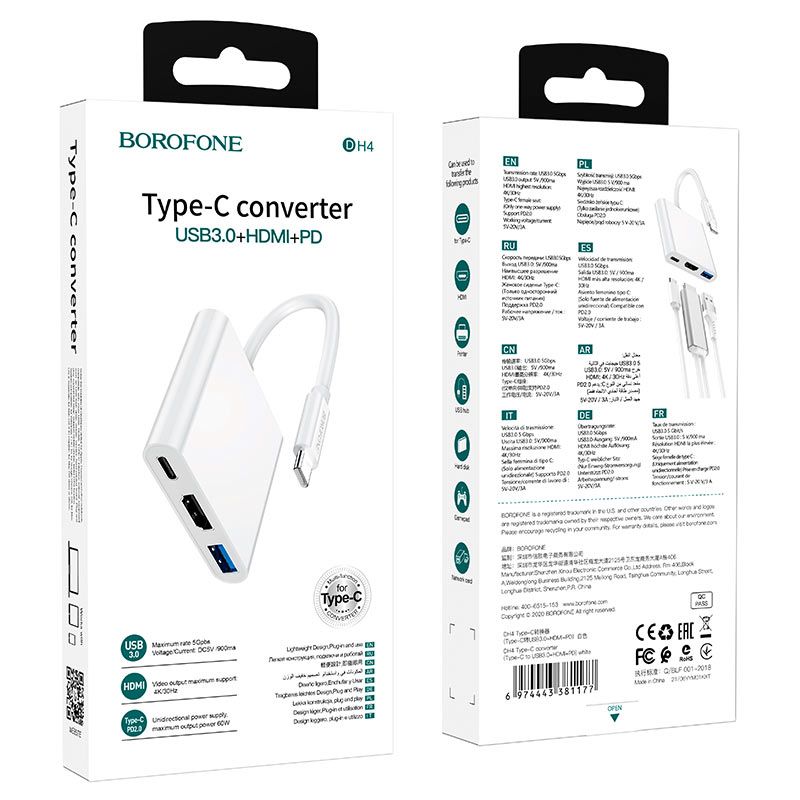 Borofone DH4 – це інноваційний та практичний перехідник, створений для підключення пристроїв з роз'ємом Type-C до HDMI, USB 3.0 та Type-C (з підтримкою PD). Він стане незамінним помічником для роботи, навчання та мультимедіа, забезпечуючи надійність та високу продуктивність. Незалежно від того, чи працюєте ви з мультимедіа, проводите презентації або передаєте дані, цей перехідник стане вашим незамінним супутником.