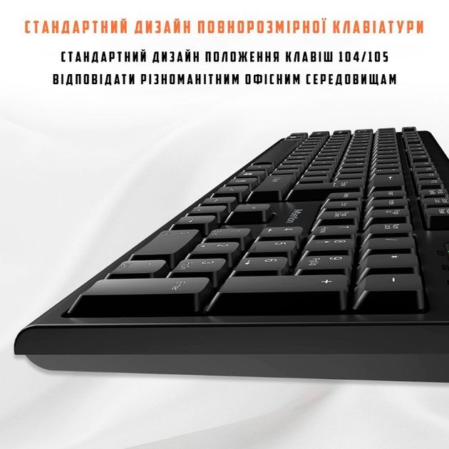 - Має 104 клавіші для зручного набору тексту та цифровий блок.