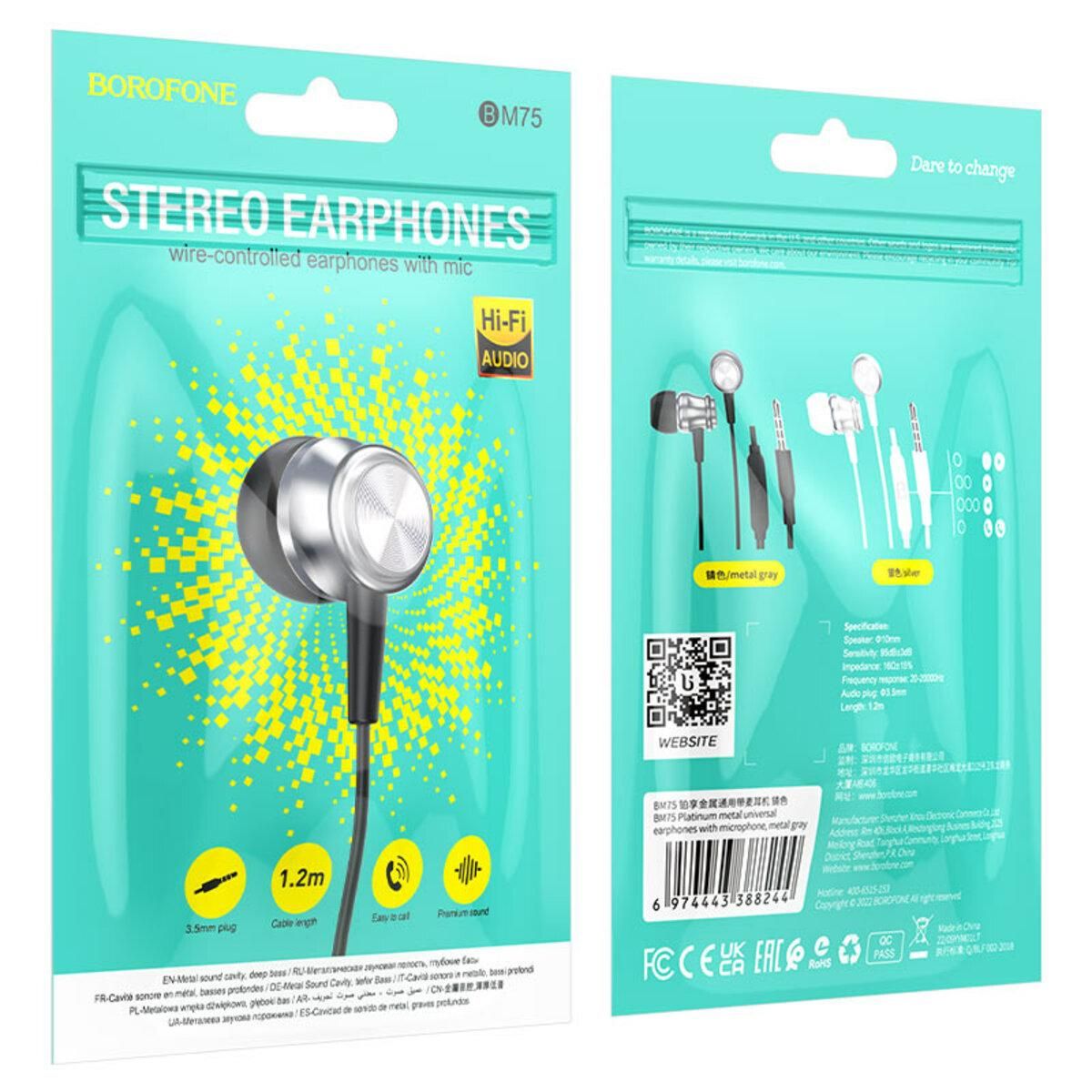 Навушники Borofone BM75 відмінно підійдуть для любителів музики, оскільки пристрій відрізняється чудовою якістю звуку. Навушники мають роз'єм mini-jack 3.5 мм та оптимальну довжину кабелю – 1.2 м. Вони також оснащені однією функціональною кнопкою та мікрофоном, підійдуть для управління Apple та Android.