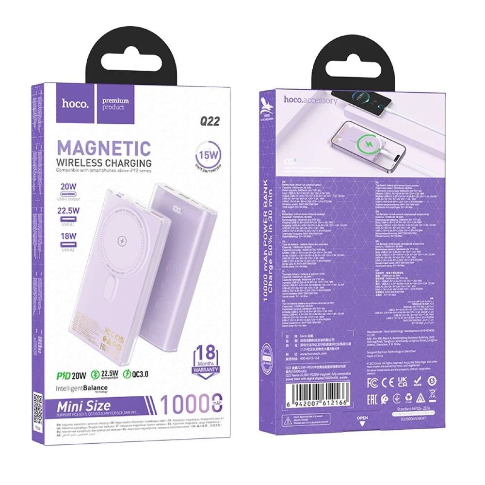 Повербанк Hoco Q22 Taurus 22.5W+PD20W magnetic fully compatible with digital displaу 10000mA Purple