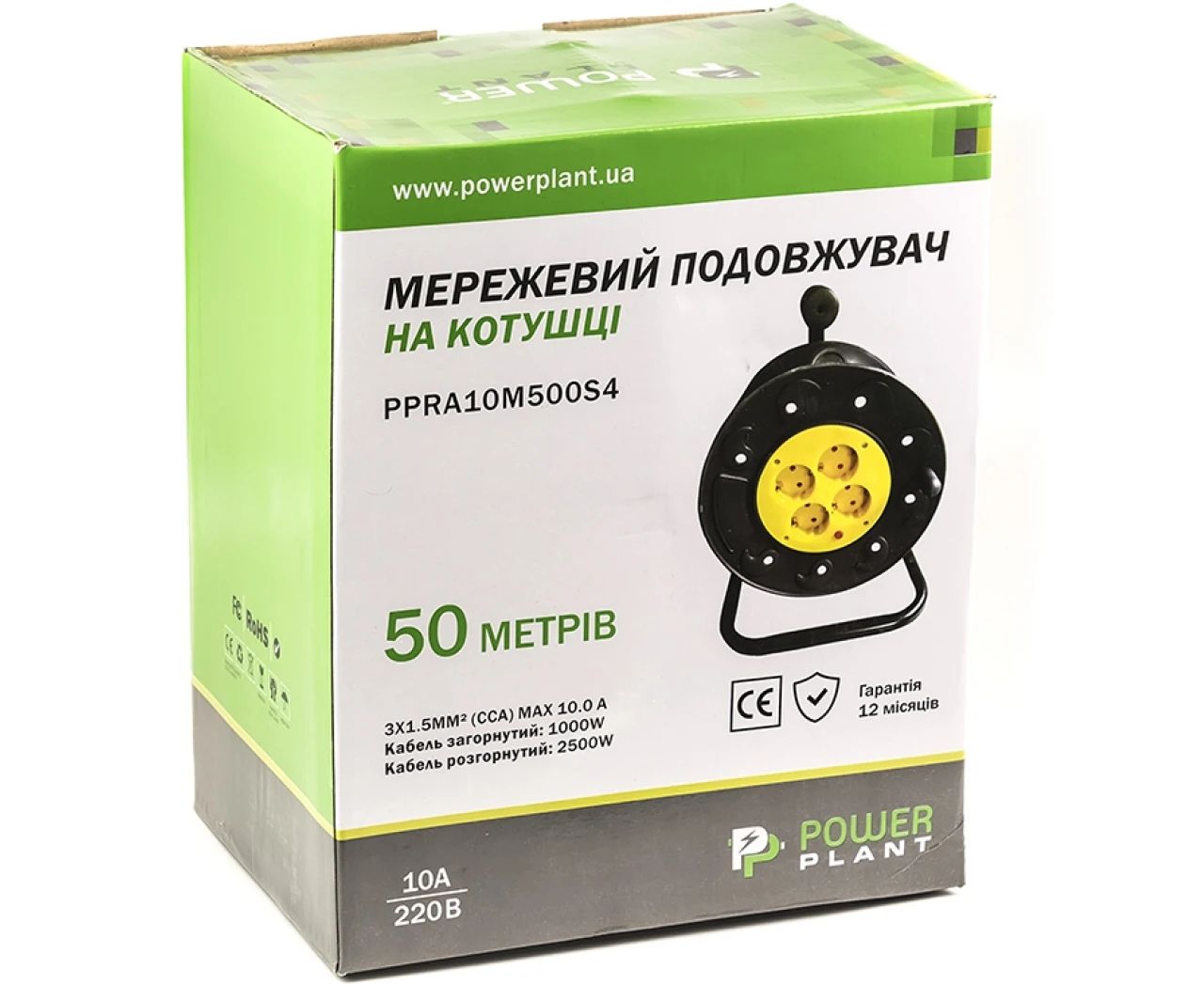Подовжувач на котушці PowerPlant, 50 м, 3x1.5мм2, 10А, 4 розетки (JY-2002/50)