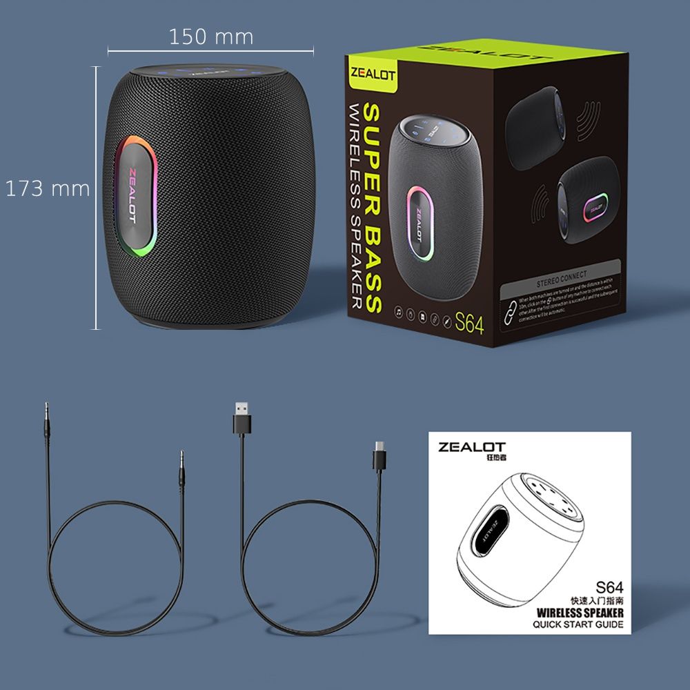 Портативна Bluetooth колонка ZEALOT S64, IPX6, BT5.2, USB, AUX, TF, TWS, 50W, 14400mAh, 6h з LED підсвічуванням black