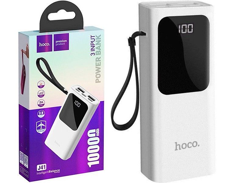 Повербанк Hoco J41 Treasure Mobile (10000 mAh / Out: 2USB 5V/2A / In: Type-C, Lightning, micro-USB 5V/2A) з LED індикатором, Білий