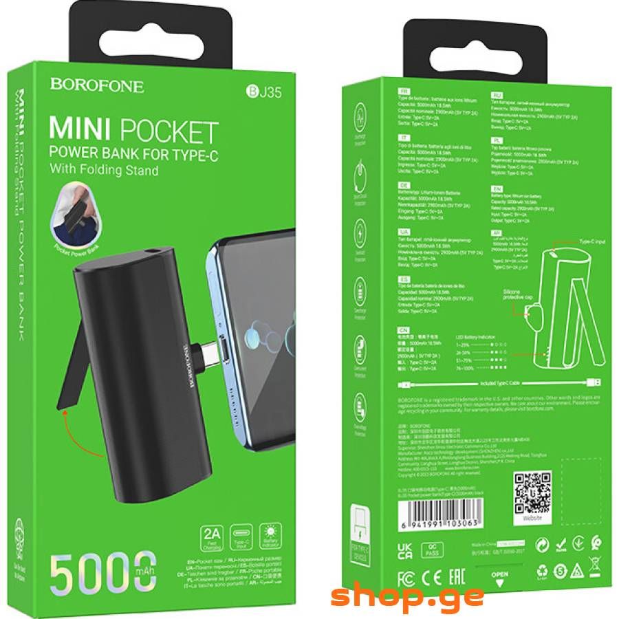 Power Bank Borofone BJ35 Pocket Type-C – це легкий, надзвичайно компактний зовнішній акумулятор, розроблений для максимально комфортного заряджання смартфонів, оснащених сучасним роз'ємом USB Type-C. Модель реалізована в оригінальному дизайні та вирізняється простотою в експлуатації. Завдяки невеликим розмірам та вазі, а також роз'єму типу male він підключається до смартфона безпосередньо без кабелів і не заважатиме його повноцінному використанню. Корпус пристрою має обтічну форму, виготовлений з міцного ABS пластику і доповнений приємною на дотик полімерною накладкою. Його практична конструкція доповнена захисним ковпачком для роз'єму. В одному з торців повербанку знаходиться роз'єм USB Type-C для заряджання його енергоефективного літій-іонного полімерного акумулятора ємністю 5000mAh. Його реальна ємність становить 2900mAh. Для його заряджання є роз'єм USB Type-C (female). Максимальна сила струму на вході дорівнює силі струму на виході роз'єму USB Type-C (male) і становить 2A при напрузі 5V. Безпечний, стабільний процес заряджання гарантується багаторівневою системою захисту від перегріву, перезаряду, стрибків напруги та короткого замикання. Не дайте своєму смартфону залишитися без енергії в невідповідний момент, забезпечте його безперебійним енергопостачанням за допомогою кишенькового повербанка Borofone BJ35.