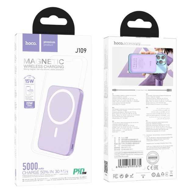 Power Bank Hoco J109 - це неймовірно компактний зовнішній акумулятор, розроблений для швидкої, комфортної зарядки портативних гаджетів. Модель виділяється підтримкою дротової та бездротової зарядки (Qi), технології MagSafe і протоколів PD2.0/3.0, QC2.0/3.0, FCP і AFC. Такий широкий функціонал робить його чудовим вибором для заряджання сучасних смартфонів, iPhone 12 і новіше, а також інших сумісних пристроїв, як-от планшети та зарядні кейси бездротових гарнітур. Завдяки невеликим розмірам він з легкістю поміститься навіть у кишені та не заважатиме повноцінному використанню iPhone під час заряджання. Корпус повербанка виконаний в стильному дизайні і надійно зібраний, виготовлений з вогнестійкого полікарбонату і міцного ABS пластику. Магнітні кільце і нижня напрямна на його верхній панелі повністю відповідають технології MagSafe і гарантують надійну фіксацію. Легко визначити рівень заряду його енергоефективного акумулятора ємністю 5000mAh допоможуть LED індикатори та механічна кнопка для їхньої активації. Аксесуар оснащений універсальним роз'ємом Type-C, який здатний постачати живлення в обидва боки за протоколами QC, AFC, FCP з потужністю до 18W (5V/3A та 9V/2A) на вході та PD, QC, AFC, FCP з потужністю до 20W (5V/2A, 9V/2.33A та 12V/1.7A) на виході. Потужність на виході бездротової може становити 5, 7.5, 10 і 15W. Максимальна загальна сила струму на виході становить 2A при напрузі 5V. У комплект до повербанка входить кабель USB - Type-C та інструкція.