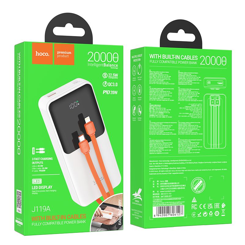 Power Bank HOCO J119A Sharp charger 22.5W + PD20 fully compatible power bank with digital display and cable (20000mAh) White