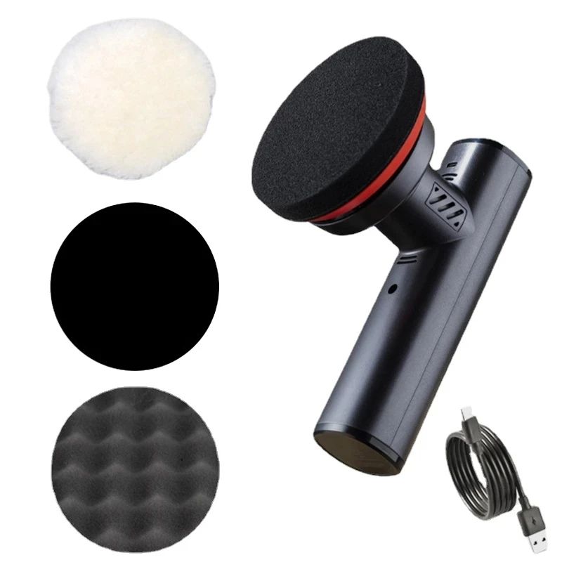 - У комплект входять три змінні насадки на липучках для різних типів поверхонь: вафельна поролонова для початкового полірування, плоска поролонова для рівномірного розподілу воску та вовняна насадка для фінального полірування.