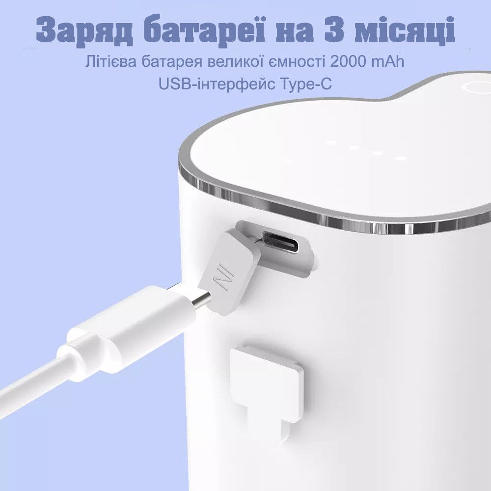 Вбудований акумулятор забезпечує надійне та тривале функціонування дозатора, а відсутність необхідності у постійній заміні батарейок робить його зручним у використанні. Заряджається цей піноутворювач за допомогою USB кабелю, що входить до комплекту. Час повної зарядки – 3 години, якої вистачає на 2 місяці безперервної роботи.