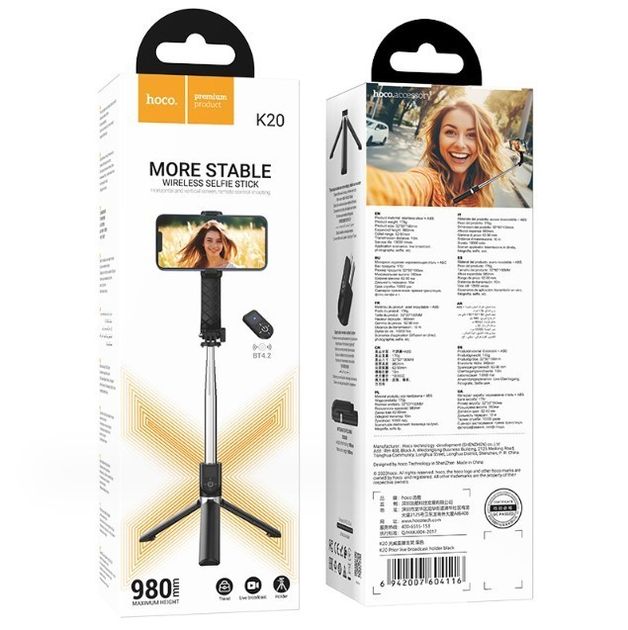 Hoco K20 – це універсальний монопод для селфі, який можна брати із собою та робити селфі та групові фотографії. Він сумісний із такими операційними системами як iOS та Android. Телефон можна розташувати як у вертикальному, так і горизонтальному положенні. Він має ергономічну ручку, тому дуже добре поміщається у руці. Стильний, легкий та компактний дизайн дозволяє носити його навіть у кишені. Розсувний механізм монопода має сім положень, кожне з яких фіксується. За допомогою пульта дистанційного керування Bluetooth можна робити групові фотографії. Робочий діапазон пульта дистанційного керування: <10 метрів.