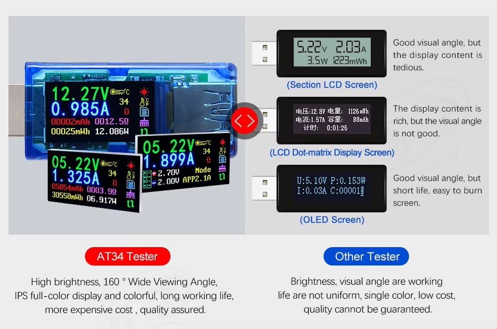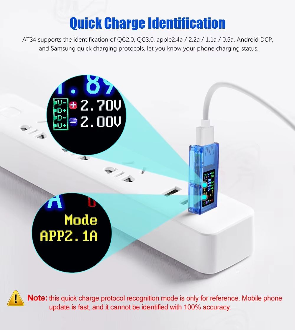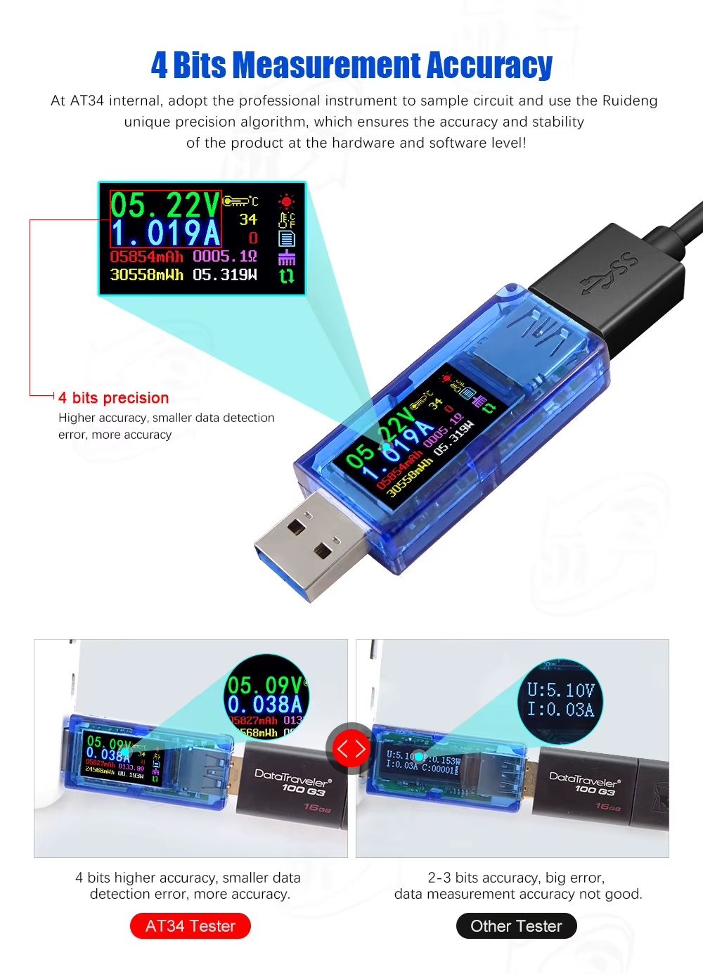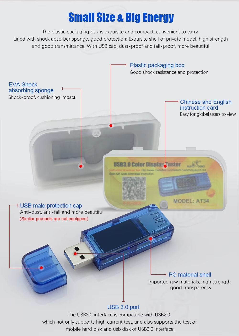 USB Charger Doctor AT34 - це універсальний USB-тестер з яскравим кольоровим IPS-дисплеєм, який дозволяє вимірювати напругу, струм, потужність та ємність. Він сумісний з інтерфейсом USB 3.0 та USB 2.0, підтримує функції швидкої зарядки і має високу точність вимірювань. Це ідеальний вибір для цифрових ентузіастів та тих, хто хоче бути впевненим у безпеці та ефективності своїх зарядних пристроїв. Висока точність вимірювань, компактність та функціональність роблять цей тестер незамінним помічником у вашому арсеналі!
