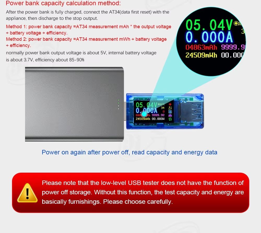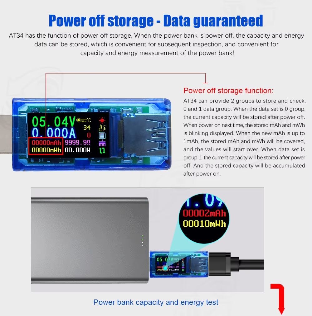 Функції: збереження даних, вимірювання ємності, опору, напруги та потужності, визначення протоколів швидкого заряджання