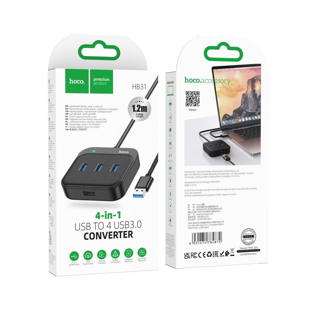 USB Hub Hoco HB31 Easy 4-in-1 converter(USB to USB3.0*4)(L=1.2M) Чорний